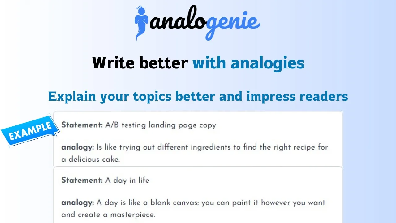 Analogenie is an analogy generator that helps you write creative analogies to grab your audiences' attention. It works by generating a complete analogy based on on your input. Explain your topics better and impress readers the one-click assistant to generate contextual analogies for your content. analogenie is a simple and intuitive tool to generate analogies & metaphors, improve your arguments, explain complex concepts, and help readers get a better understanding of your content. Increases the impact of your writing and ensures that it resonates with your audience. Provides context and relevance to ideas and concepts, allowing you to communicate your message more effectively. Makes it easy to quickly create meaningful analogies & metaphors that can help elevate the quality of your writing. Generates analogies & metaphors quickly and easily with only a click, allowing you to create content that's clear and in-depth.