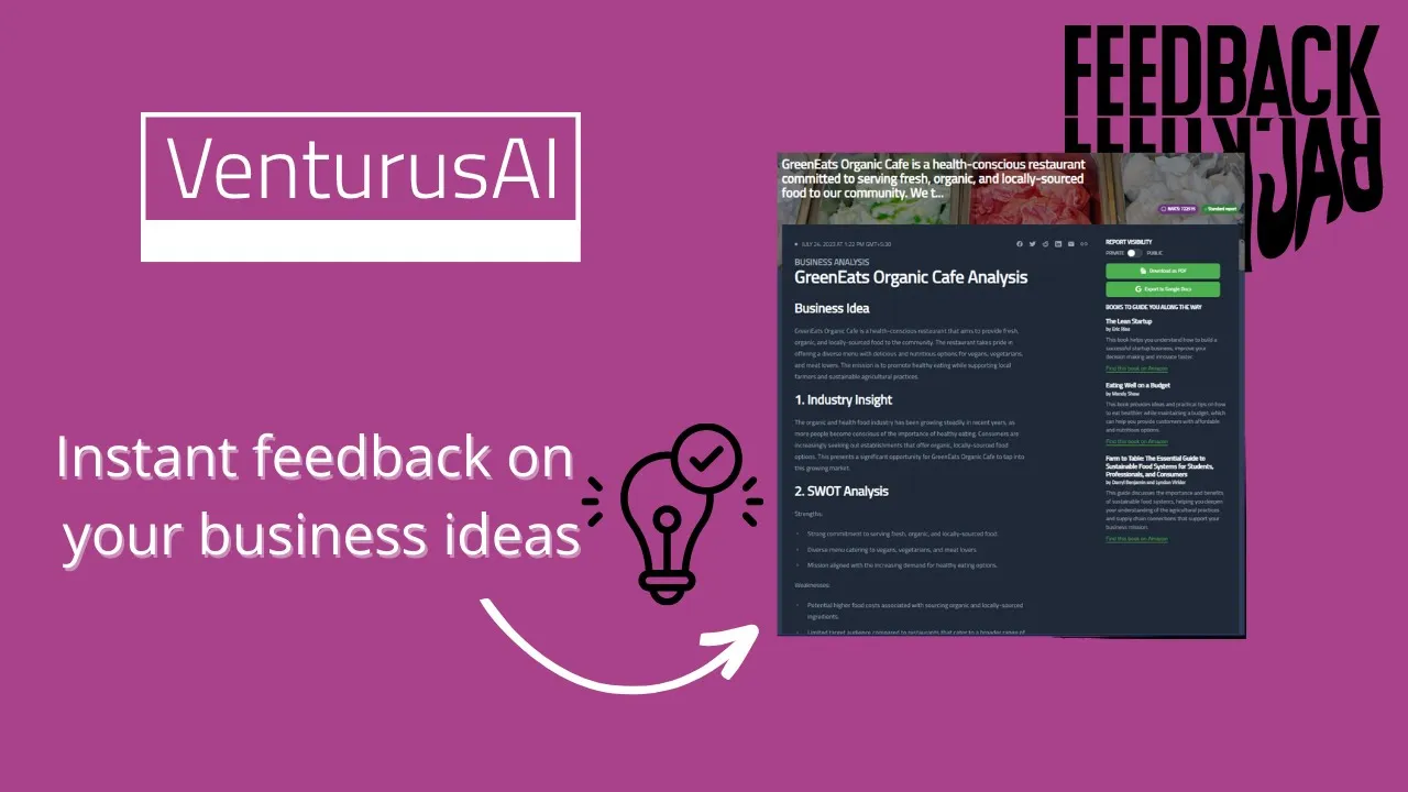 VenturusAl can analyze your business ideas and provide you with comprehensive feedback on how to make them successful. It's the perfect tool for any business.